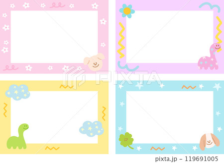 Cute pastel frame set with dinosaur, puppy, clover leaf, flowers for cartoon background, wallpaper, backdrop, polaroid frame, photo card, banner, rectangle ad template, print, animal, zoo, pet shop