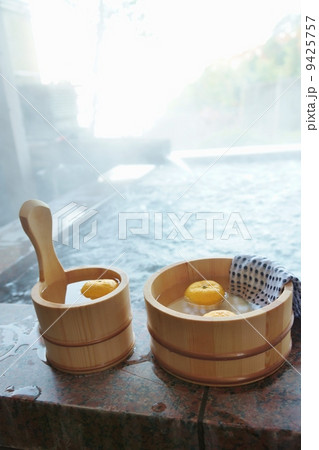 秋冬の素材・温泉の朝、湯煙りに霞む湯桶に柚子の実・縦位置
