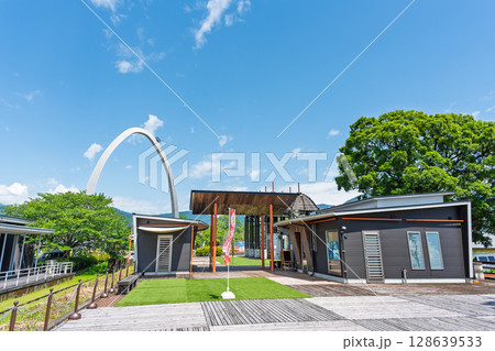 青空を背景に映える くま川鉄道湯前駅に隣接する複合施設「湯前駅レールウイング」 熊本県球磨郡湯前町