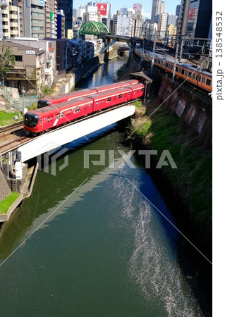 東京都文京区湯島外堀通りから望む聖橋と中央本線電車とさくら