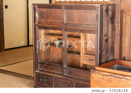 和風レトロインテリアの家具と雑貨アイコンセット|タンス 茶箪笥 やかん 魔法瓶 湯のみ