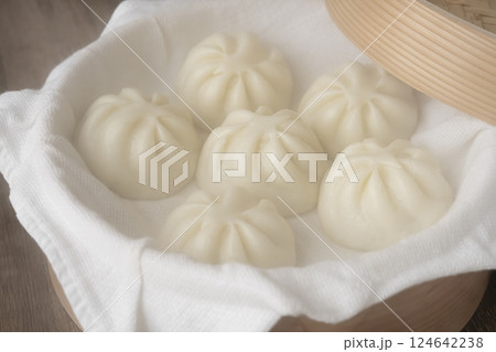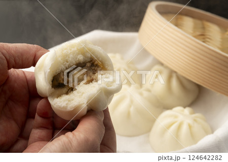 セイロで蒸した湯気の立った肉まんを手で持つ