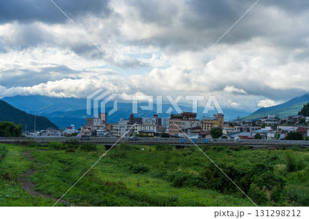 湯田中温泉の町並みと川沿いの夏景色
