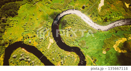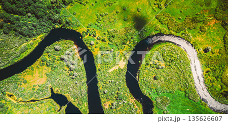 Aerial View Green Forest Woods And River Landscape In Sunny Summer Day. Top View Of Beautiful European Nature From High Attitude. Drone View. Bird's Eye View. Little Small Planet Concept