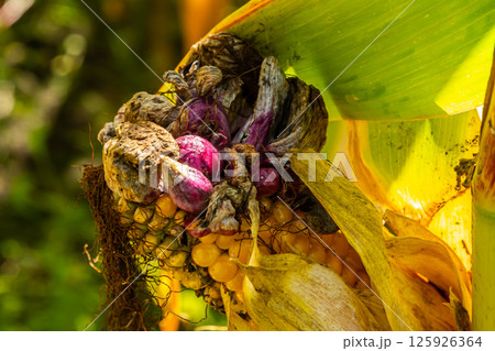 Fungi growing on yellow corn stalks in a lush agricultural environment during midday