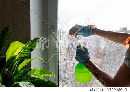 A hand holds a green spray bottle, misting water over lush indoor plants by a sunny window, creating a refreshing and healthy environment for plant care.