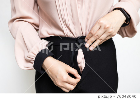Hands of lady girl trying to zipping up her pants,try to close her tight pants with difficult from fat,weight gain,overweight or asian business woman having problem with zipper of trousers,bad quality