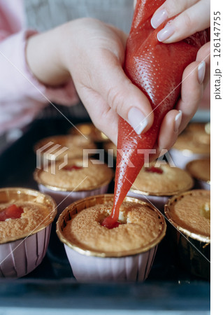 Filling Cupcakes with Strawberry Sauce from Piping Bag