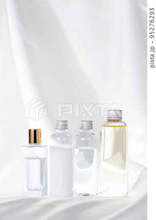 白いサテン生地に並べたガラスとプラスチック化粧品ボトル4個