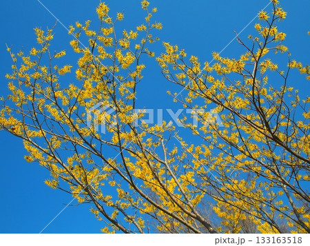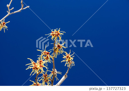 マンサクの花 春の訪れを告げる黄色い花 青空背景 日本の早春の自然風景