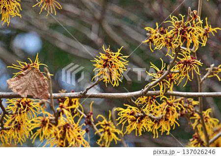 枯葉の残った枝に花をつける早春のマンサクの枝