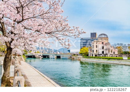 満開の桜と原爆ドーム 平和記念公園の春の風景 広島観光名所 2023年G7サミット