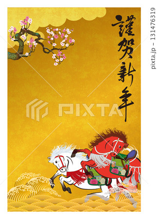 藤娘の羽子板と雲&梅文様の年賀状素材