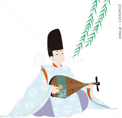 日本の古典衣裳。しだれ柳と狩衣で琵琶を弾く男性。平安のイメージのイラスト
