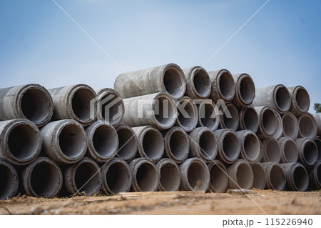 A stack of concrete ring pipes piled and creating a symmetrical arrangement