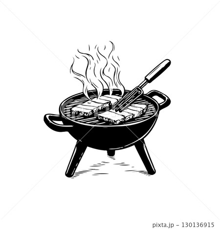 Monochrome illustration of grilling meat on a barbecue for outdoor cooking