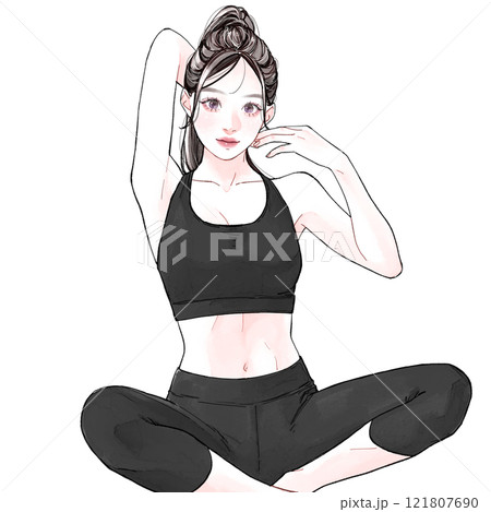 運動前後のストレッチをする女性 人物の手描き水彩イラスト素材