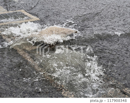 冠水した道路で車が水しぶきを上げながら走行する様子