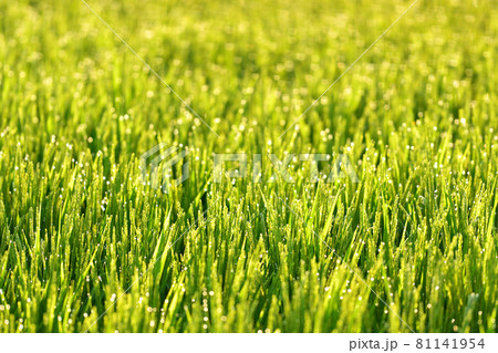 北杜市白州町、稲の葉の水滴、キラキラ光る