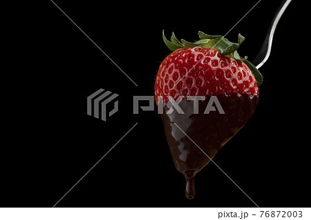 スプーンにのせたイチゴの上に滴り落ちる液状のチョコレート