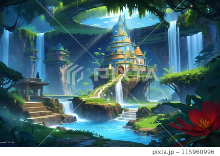 ゲーム背景 異世界テーマパーク風不思議な滝と岩茸国のお城