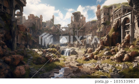 ゲーム背景 ファンタジーワールドの古代遺跡がある峡谷