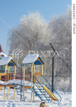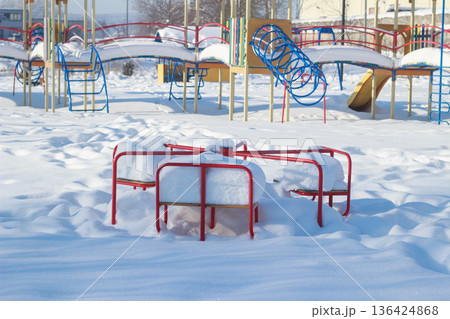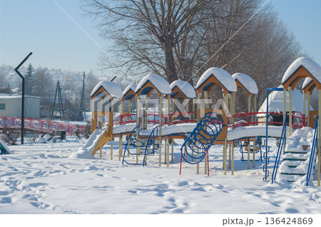 Colorful Children Playground Covered in Thick Snow on Sunny Winter Day