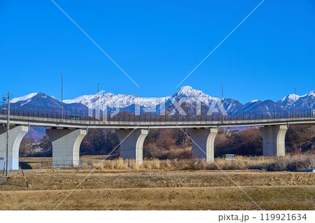 冬の長野県茅野市の多留姫大橋越しに八ヶ岳連峰を見る