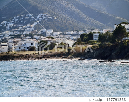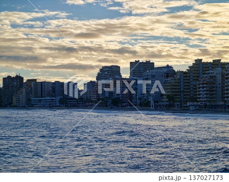 village by sea during sunset hours, shoreline community bathed in warm evening light and calm