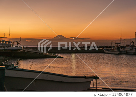 夕暮れの漁港と富士山 神奈川県三浦半島