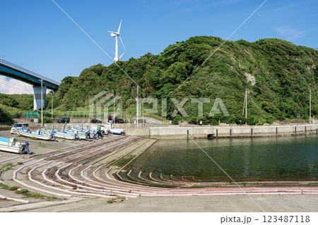 青空と風力発電が映える三浦市宮川港の漁港風景 静かで美しい漁港