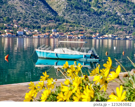 Blue boat against a background of mountains and flowers in spring, Kotor, Montenegro.