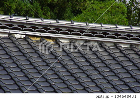 屋根の棟瓦の漆喰が剥がれ落ちた様子を撮りました。