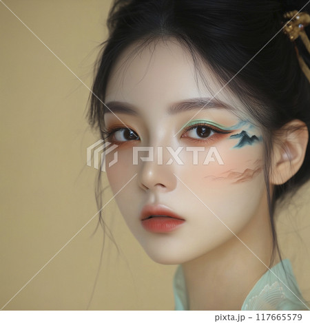 伝統的な衣装を着たアジア人女性 顔にフェイスペイント
