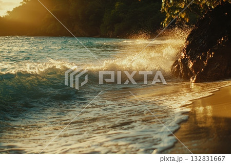 Gentle Waves Crashing Against Smooth Rocks on a Serene Beach at Sunset
