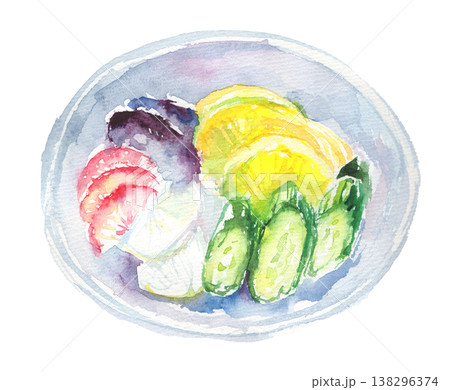 水彩タッチの漬物盛り合わせ・きゅうり沢庵茄子赤かぶのお皿