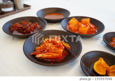 Assortment of Korean traditional side dishes (Banchan), including kimchi served on restaurant table
