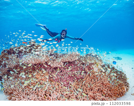 素晴らしいサンゴ礁と美しいデバスズメダイ他の群れとダイバー(沖縄県島尻郡慶良間諸島阿嘉島北浜ビーチ沖