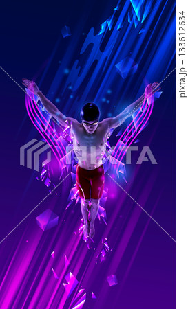 Neon sports poster of male swimmer diving downward in purple blue motion.