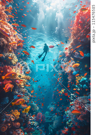 A stunning, underwater image of a scuba diver exploring a colorful coral reef, surrounded by a variety of marine life and crystal-clear waters. Generative AI.