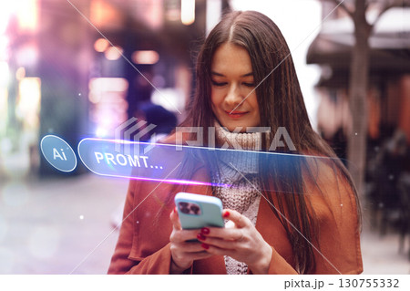 Young woman using smartphone outdoors near busy street while engaging with AI technology during a chilly day