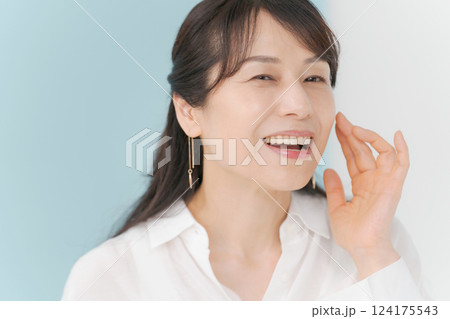 鏡をみながらスキンケアをする肌が美しい素肌感のある女性のクローズアップ目を閉じる