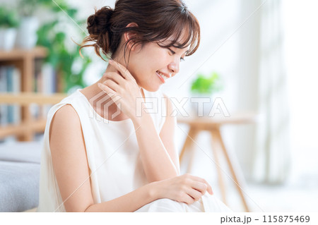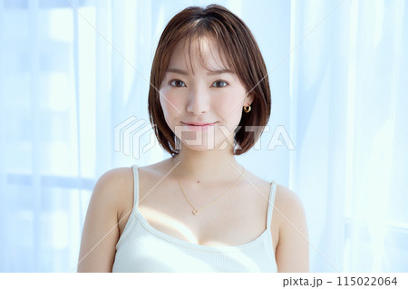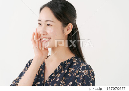 20代女性ビューティーイメージ (スマートフォン、黒髪ロングヘア、ノースリーブ)