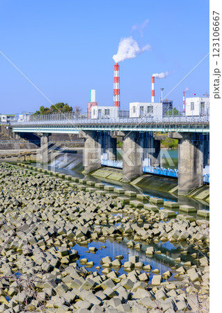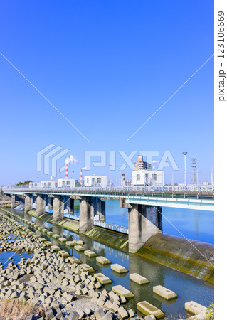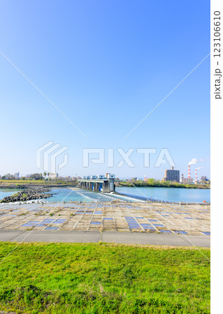 青空を背景に映える球磨川分流堰の新前川堰から観える風景「八代市」