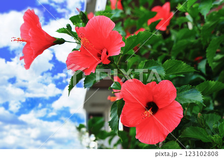 夏空の下で大きな赤い花を咲かせるリゾート気分満点のハイビスカス