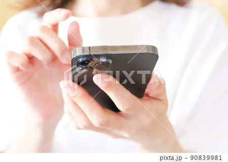 ソファーに寝そべる私服の若い女性 リビング スマホ
