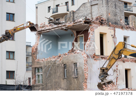 Road construction. Excavator repairing destroyed bridge after hurricane flooding water washed away asphalt in Florida. Construction equipment at roadwork site