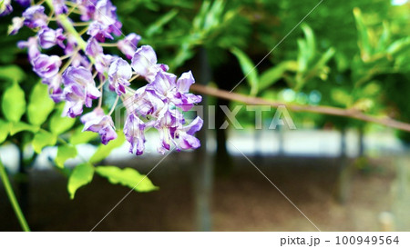 朝の晴天に咲く藤の花
