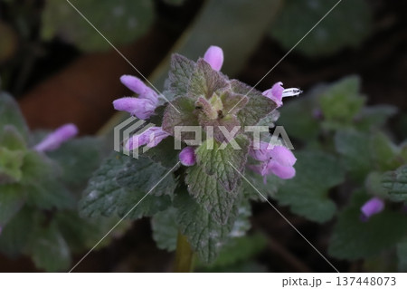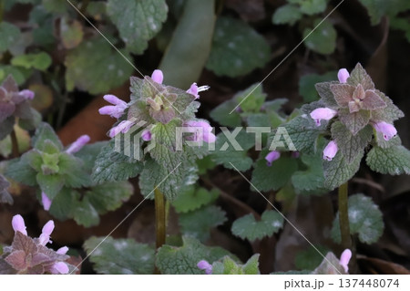 早春の道端に咲くピンク色の小さなヒメオドリコソウの花
