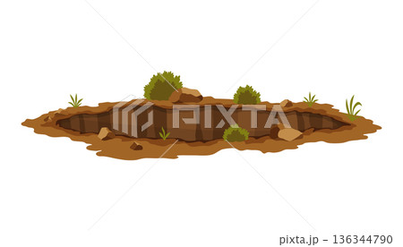 Hole ground. Works digging of sand coal waste rock or gravel. Brown, dry mine element of landscape. Cartoon illustration